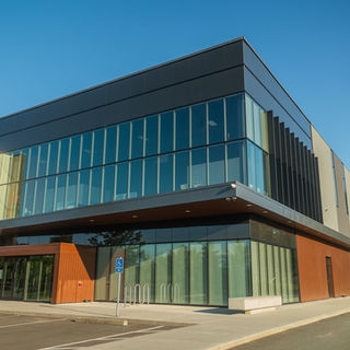 Products - Kawneer's 1600UT/1620UT combined with PFG's Cardinal LoE glass as well as a custom horizontal wood grain hanging trellis.